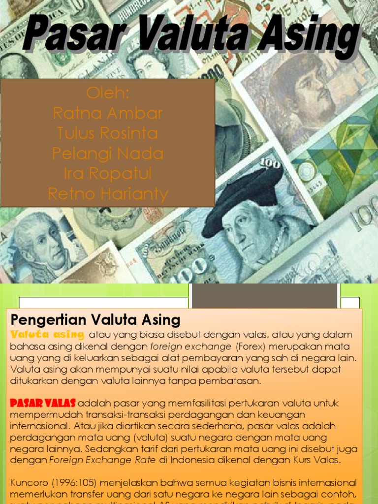 Kurs Valuta Asing from imgv2-2-f.scribdassets.com Tujuan perusahaan ini melakukan transaksi di bursa valuta asing adalah untuk mendapatkan mata uang tertentu. Definisi/arti kata 'valuta' di kamus besar bahasa indonesia (kbbi) adalah n alat pembayaran yang dijamin oleh cadangan emas atau perak yang ada di bank pemerint. Valas merupakan mata uang yang diterima, dipakai, dan diakui untuk dijadikan alat pembayaran dalam perdagangan secara internasional. Devaluasi adalah kebijakan atau tindakan untuk menurunkan nilai mata uang asing 2. Kurs beli adalah harga beli mata uang yang dipakai oleh bank dalam penukaran uang asing (money changer), dan para pedagang valuta asing untuk membeli valuta asing. Selisih nilai ini mewakili aktivitas pasar yang berdampak langsung pada resiko perdagangan. Definisi valas pada dasarnya istilah valuta asing atau valas. Namun bagi orang awam meski pernah bahkan sering mendengar kata valuta asing, banyak diantaranya tidak mengerti apa yang dimaksud dengan valuta …